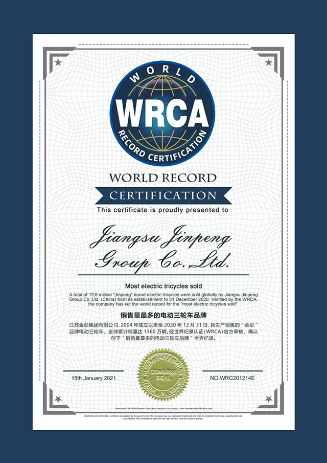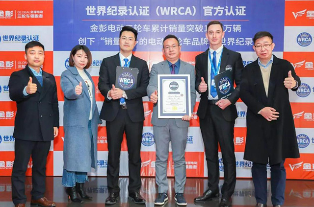 2020年底,金彭以“累計電動三輪車銷量1360萬輛”正式向WRCA申請?zhí)魬?zhàn)“銷售量最多的電動三輪車品牌”世界紀(jì)錄,經(jīng)過WRCA官方的嚴(yán)苛審查和反復(fù)論證,最終認(rèn)定金彭挑戰(zhàn)成功,并將其記入世界紀(jì)錄大全史冊,金彭的“世界之最”終于得到了國際權(quán)威機構(gòu)的認(rèn)可。