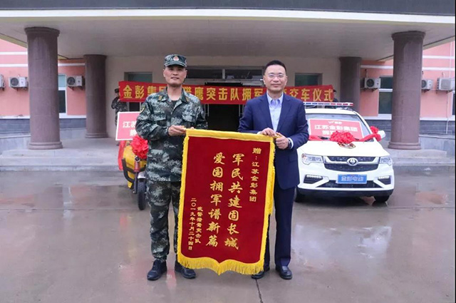 活動最后,金彭集團總裁劉志培向獵鷹突擊隊交接了擁軍車輛,獵鷹突擊隊為江蘇金彭集團授予擁軍錦旗,多方領導共同合影留念。