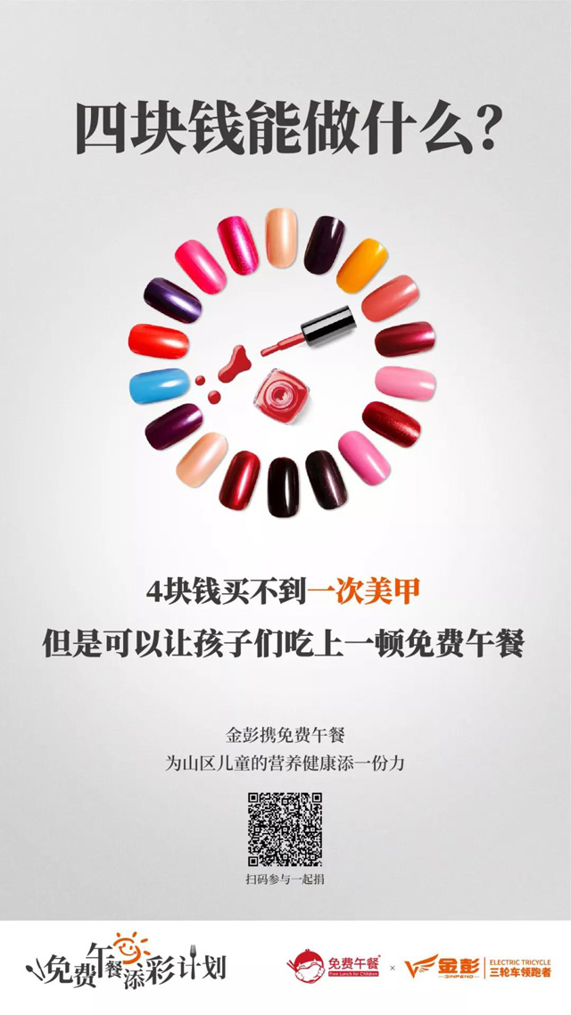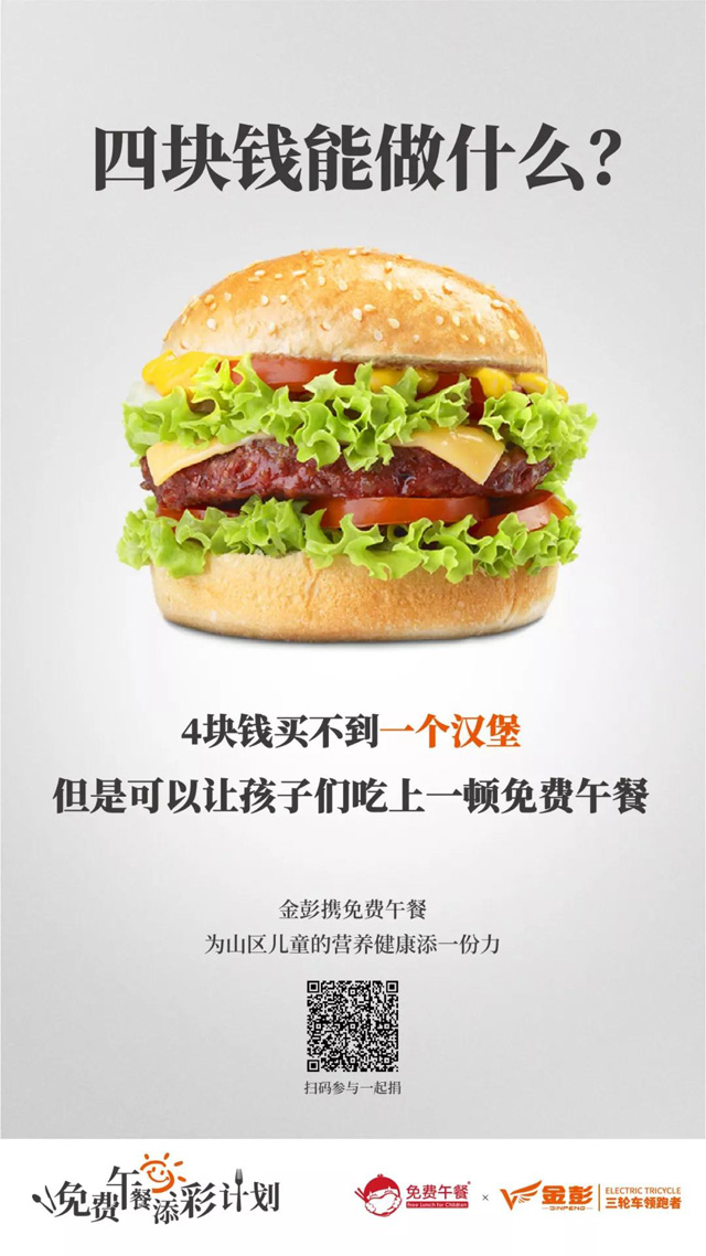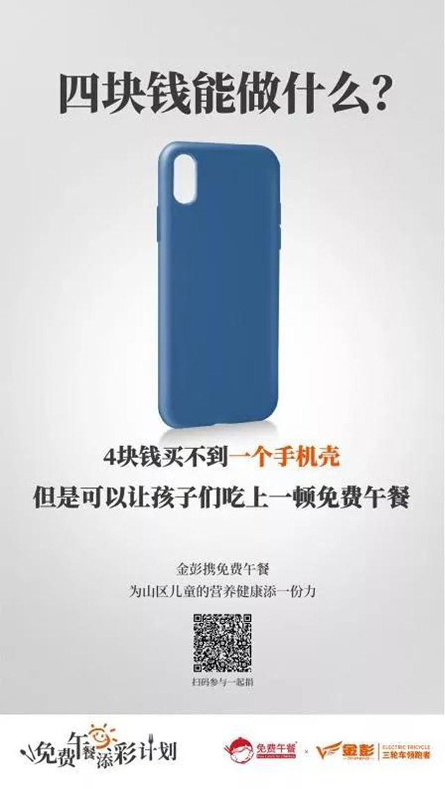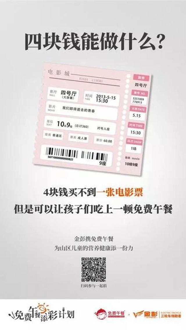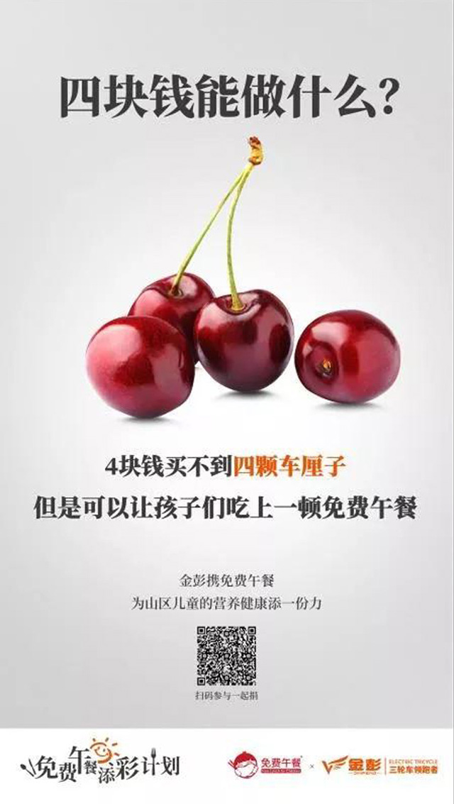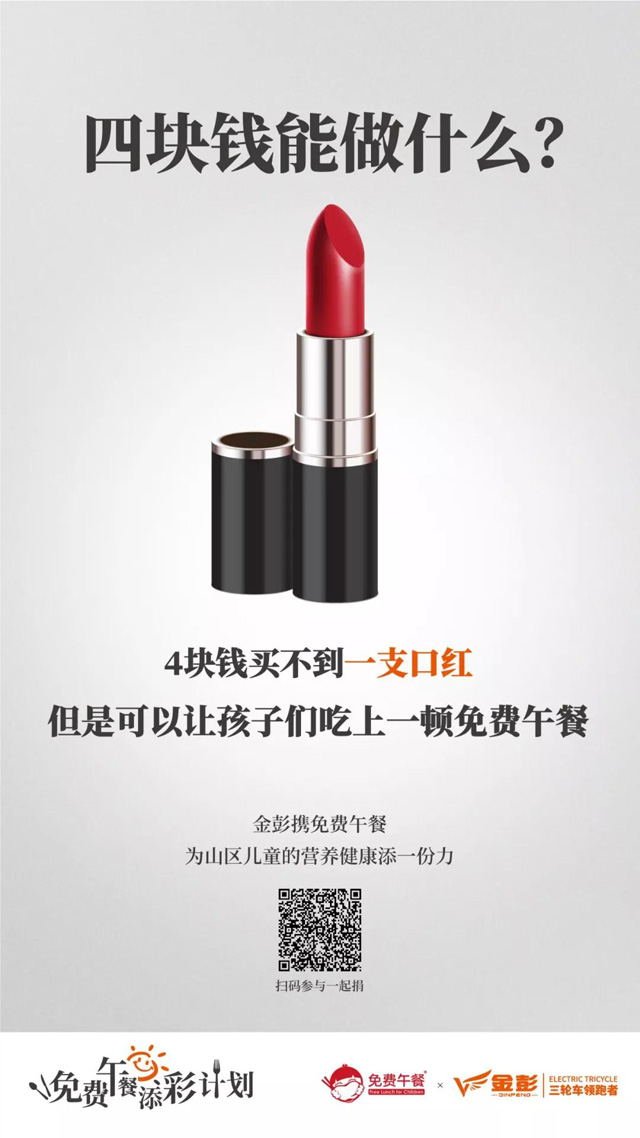 今年的6月1日,金彭將再次攜手免費午餐,前往河南南陽臥龍區龍王溝風景區陳家崗小學,針對此次公益活動,金彭發起了添彩計劃支援者征集令。